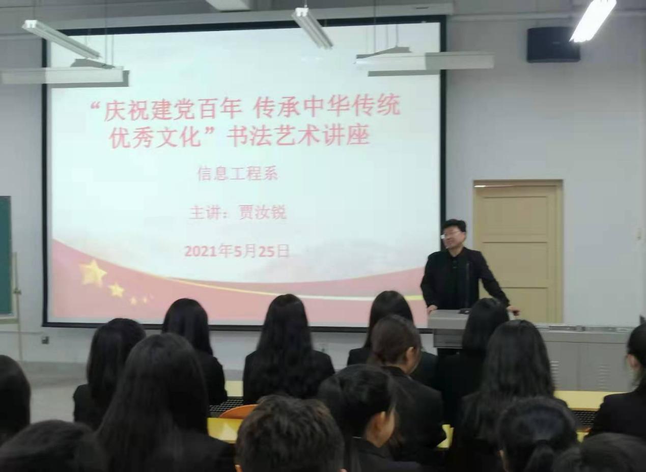 为喜迎建党百年,学院开展了形式多样的系列庆祝活动,我系党支部在学院(州职校)进行第五届春季田径运动会之际,组织大数据与会计、电子商务、计算机应用专业书法爱好者100多人,在博知楼301多媒体教室开展“庆祝建党百年 传承中国传统优秀文化”书法艺术讲座。学院图文信息中心主任、系党支部书记、副教授贾汝锐主讲,教务处副主任、大数据与会计专业负责人祁昌才主持讲座。