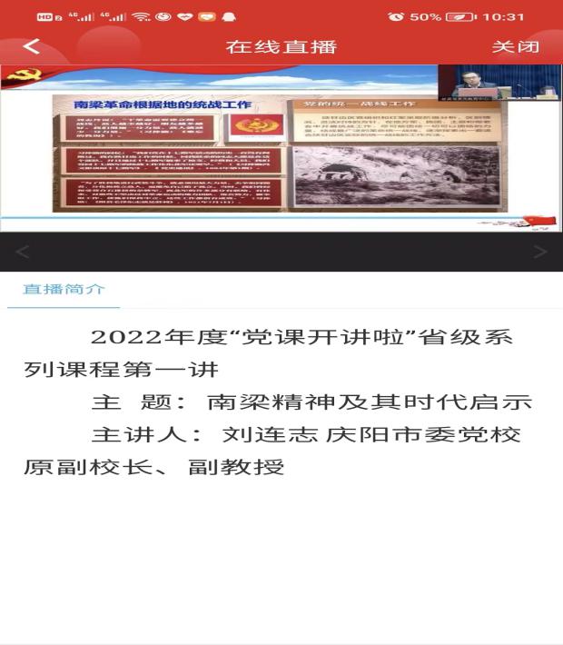 庆阳市委党校原副校长、副教授刘连志以“南梁精神及其时代启示”为主题,用生动活泼、通俗易懂的语言,阐述了革命先辈在环境极其艰苦、物资严重匮乏、生活非常困难的条件下培育形成的以面向群众、坚守信念、顾全大局、求实开拓为主要内容的南梁精神。