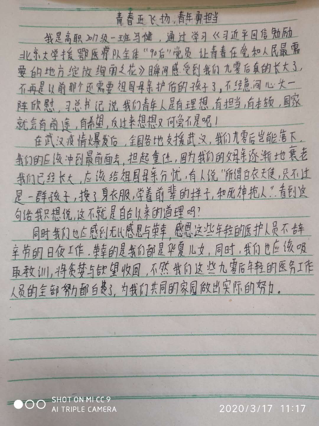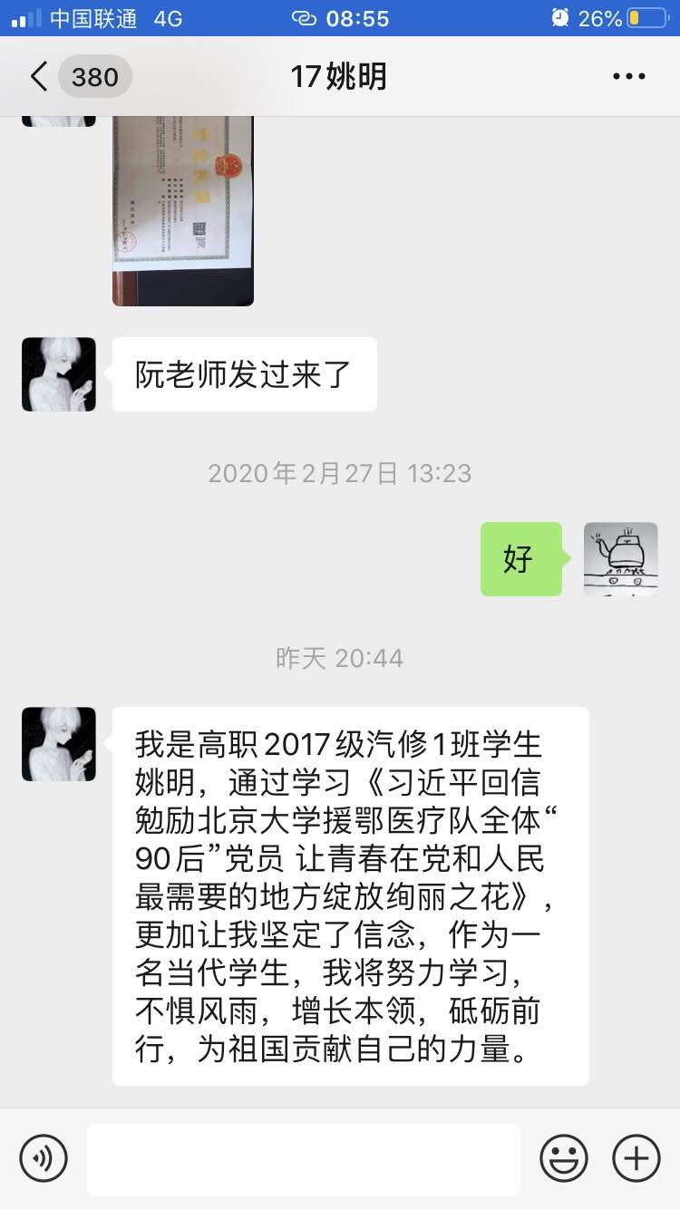 7.17级高职汽修二班的杨佛鹏,通过学习《习近平回信勉励北京大学援鄂医疗队全体“90后”党员 让青春在党和人民最需要的地方绽放绚丽之花》,更加让我坚定不移的信念,当作一名大学生,让我懂的了中国遇到了困难,我们作为时代的青年人,应该勇往直前和无所畏惧,让我们一起守护这个美丽的中国,让我们早日实现伟大的抗疫战争。最后我说一句让我们当一个有理想、有本领、有担当的大学生,让我们贡献自己的身体和力量,迎来伟大的胜利。